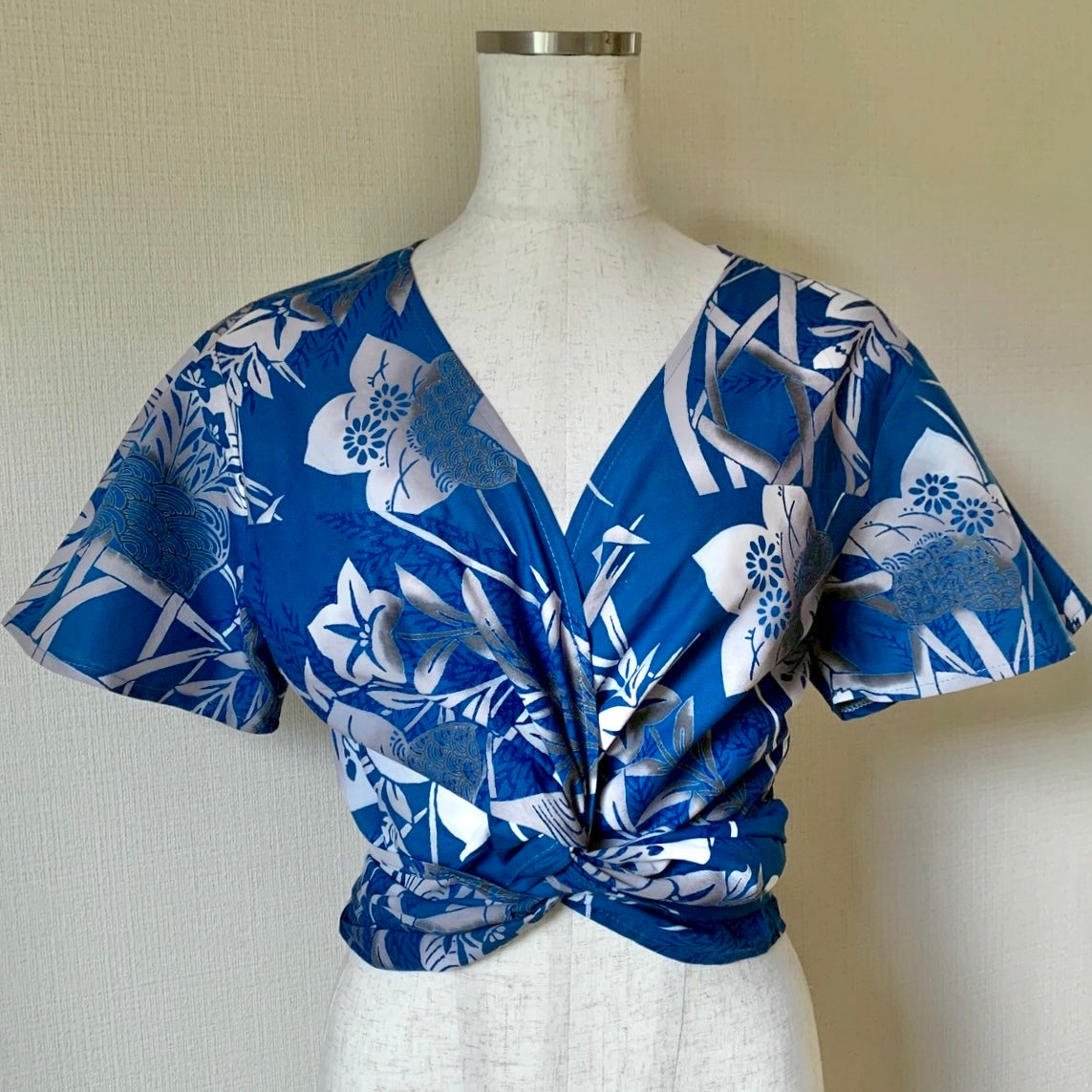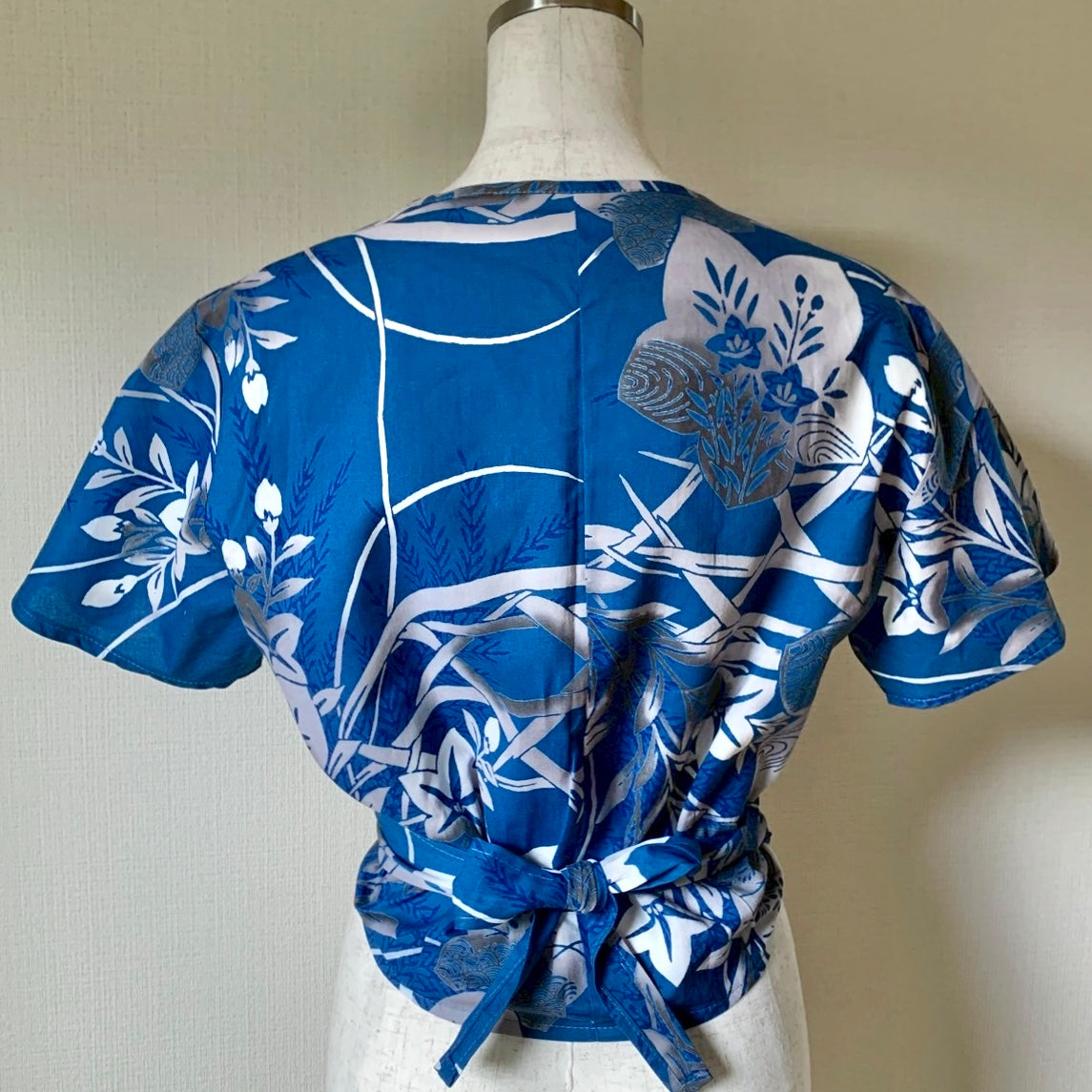 2 ways wrapped blue Yukata shirt with lovely flower motif
