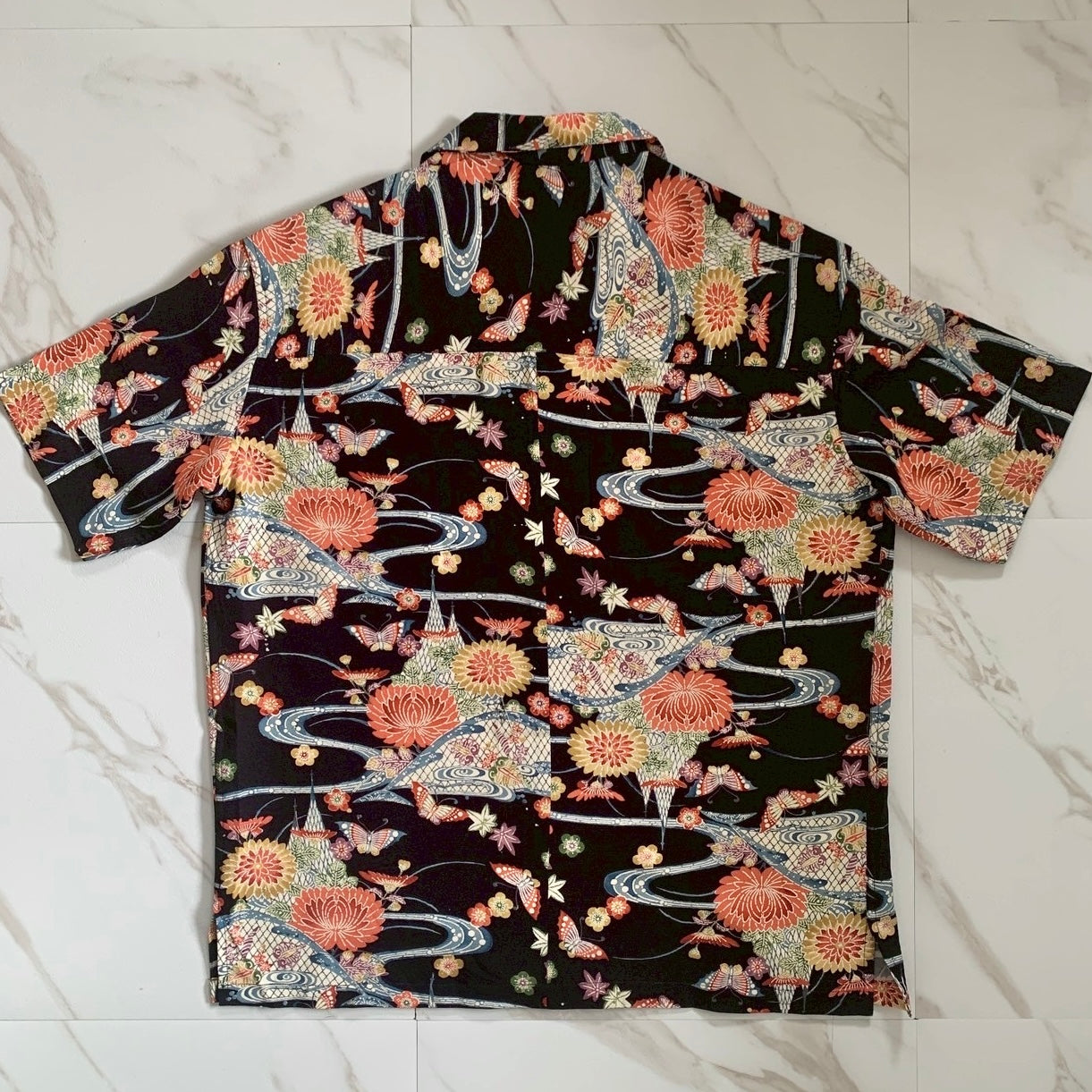 Half sleeve unisex silk shirt made from Kimono with lovely traditional Japanese flower motif.